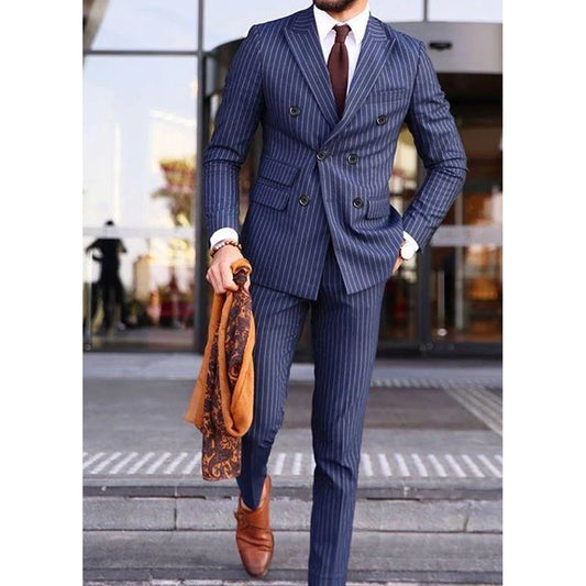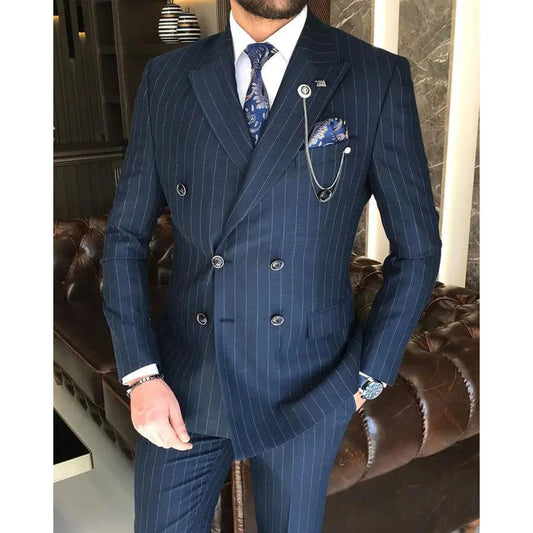 Luxury Men Suits Blue Stripe Double Breasted Peak Lapel Regular Length Formal Office Male Clothing Slim Fit 2 Piece Jacket Pants