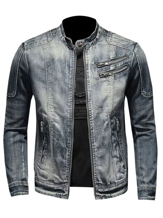 Men's Retro Denim Jacket Casual Oversized Stand Up Collar Zippered Jacket Cycling Motorcycle Coat Trend Loose Fit Top