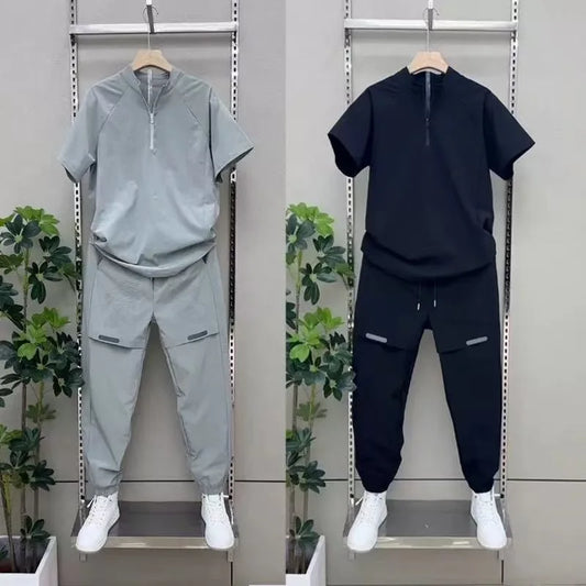 2025 Summer Breathable ice Silk Casual Sportswear Set, fashionable zipper quick-drying casual long pants and short-sleeved 2pcs