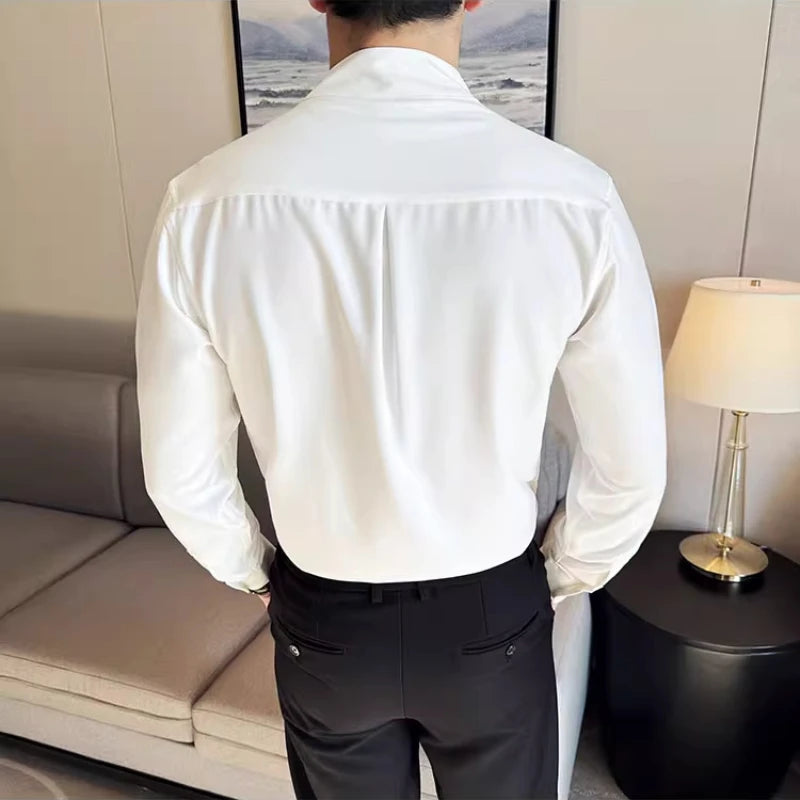 Advanced Sexy V-neck Men's Long Sleeved Shirt Designer Stand Up Collar Shirt Business Social Slim Fit Black and White Top